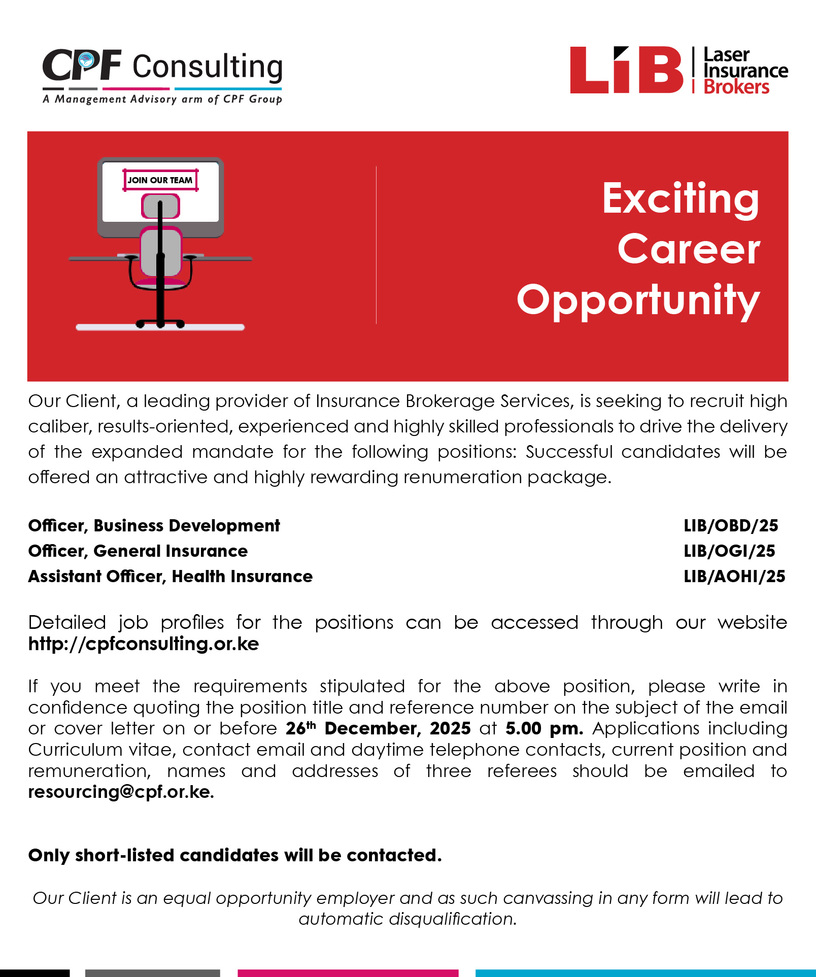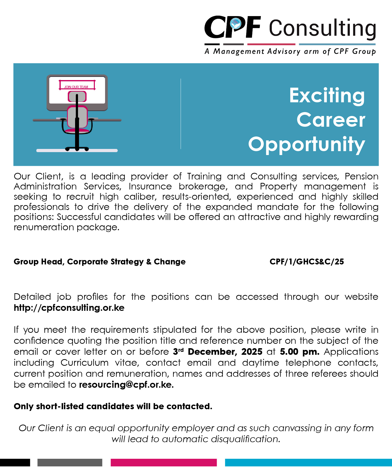 Our Client, is a leading provider of Training and Consulting services, Pension Administration Services, Insurance brokerage, and Property management is seeking to recruit high caliber, results-oriented, experienced and highly skilled professionals to drive the delivery of the expanded mandate for the following positions: Successful candidates will be offered an attractive and highly rewarding remuneration package.